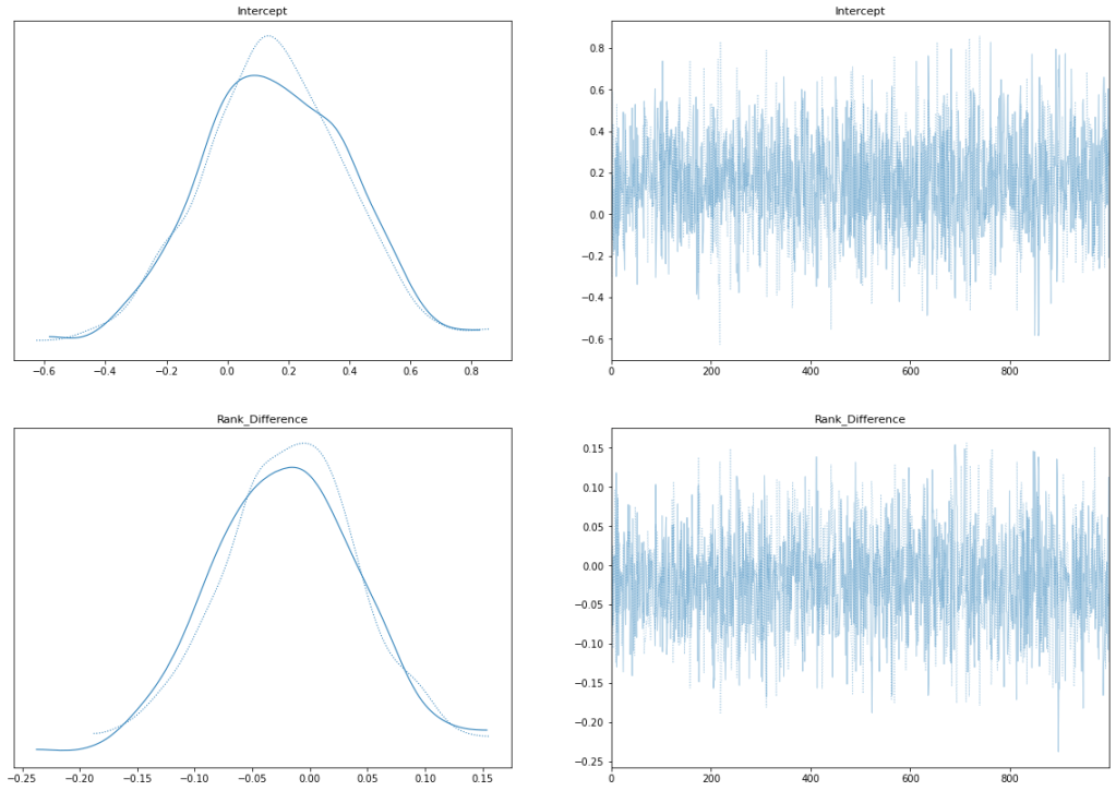 After applying the markov chain monte carlo (MCMC) sampling to some reasonable priors and hitting the “inference button”, my program spit out posterior distribution estimates for what our model parameter coefficients should be: